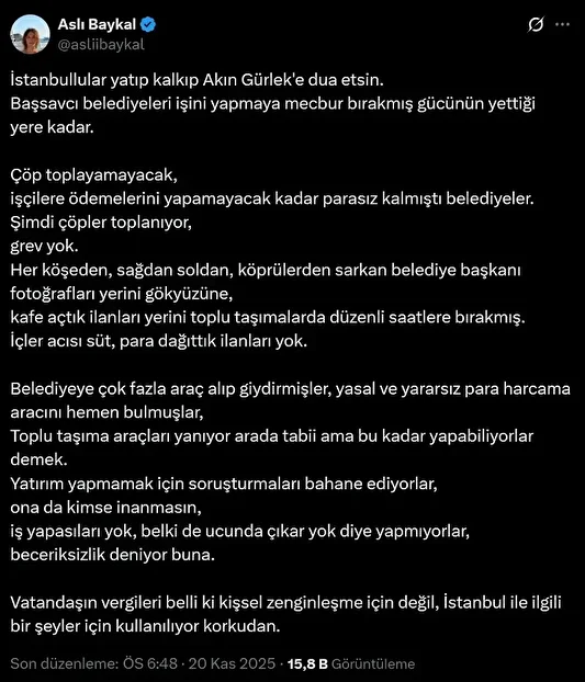 Aslı Baykal’dan ‘yeniden hizmete kavuşan’ İstanbullulara: Yatıp kalkıp Akın Gürlek’e dua edin