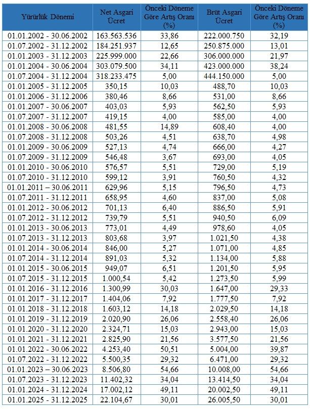 2002 yılında 184,25 TL olan net asgari ücret, 2025 yılında 22.104,67 TL oldu. Bu sürede, net asgari ücret, 2002 yılına göre 2025 yılında nominal olarak 119 kat artırıldı.